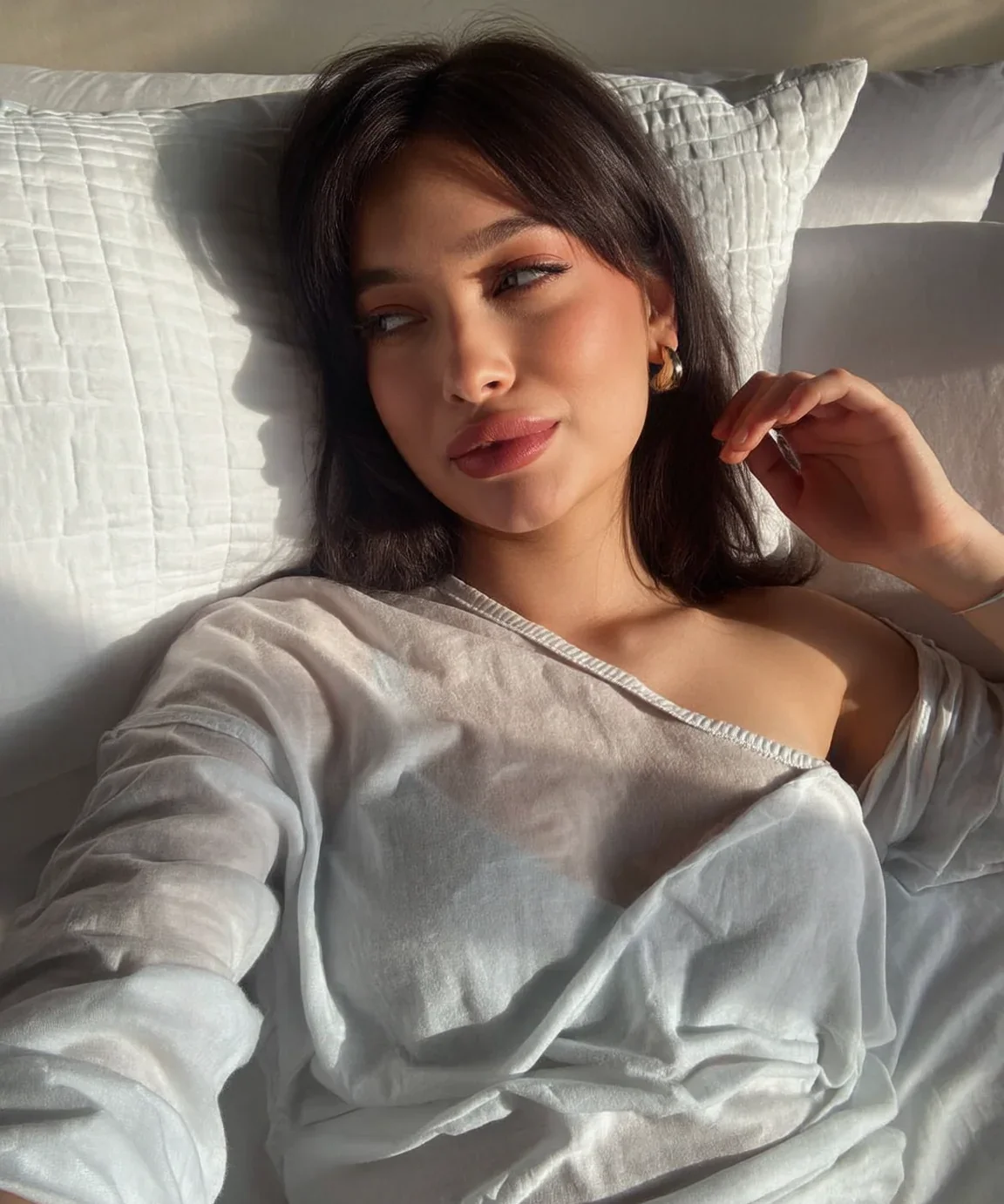 Lena is lying on white linen pillows with morning sunlight cutting across her face and shoulders. She's wearing an oversized white shirt that's slipped off one shoulder, small gold hoop earrings catch...