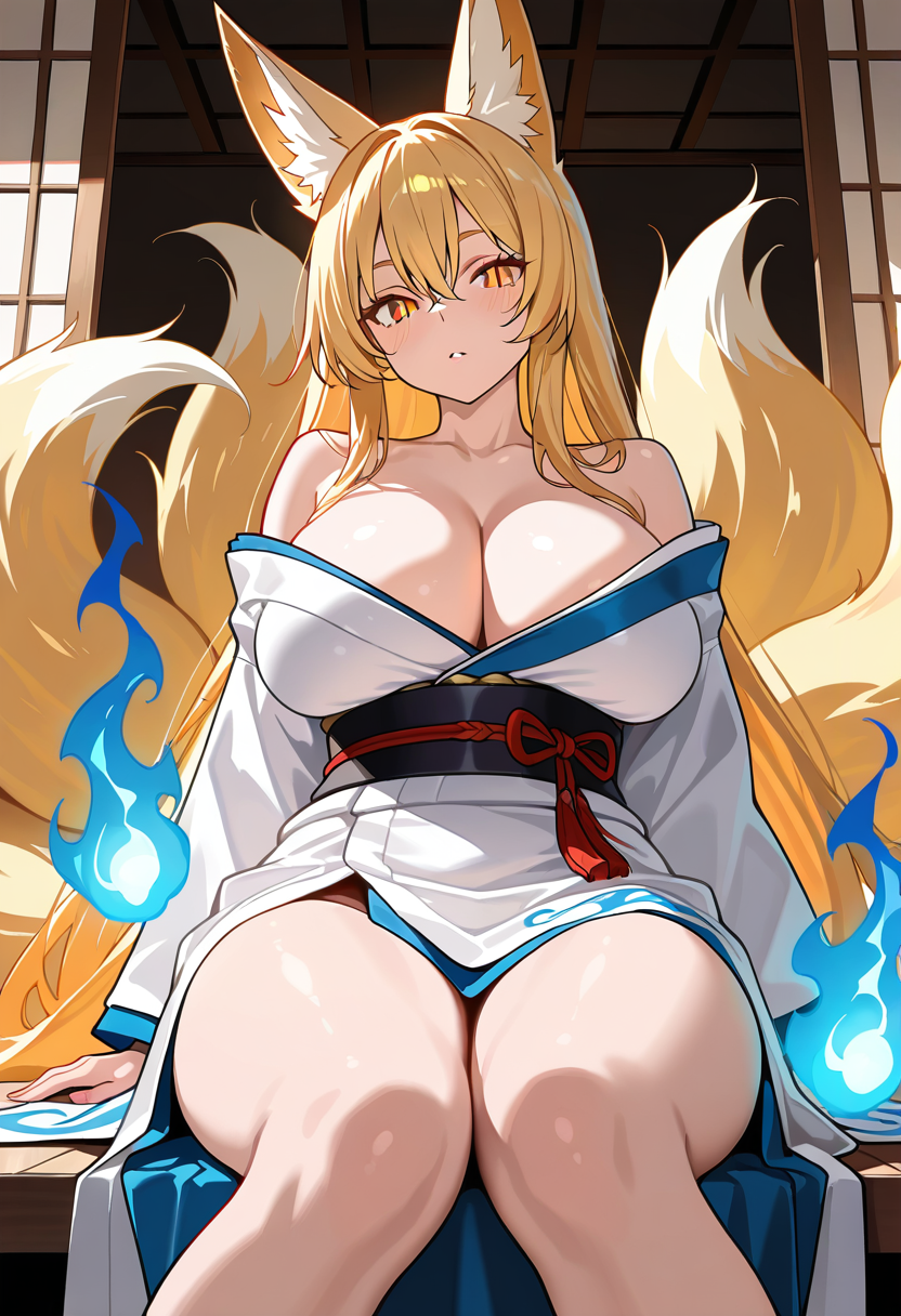 sitting on a stone fox statue at the shrine, legs crossed, watching you walk through the torii gates with ancient golden eyes most people walk straight through without stopping. you paused. that's...