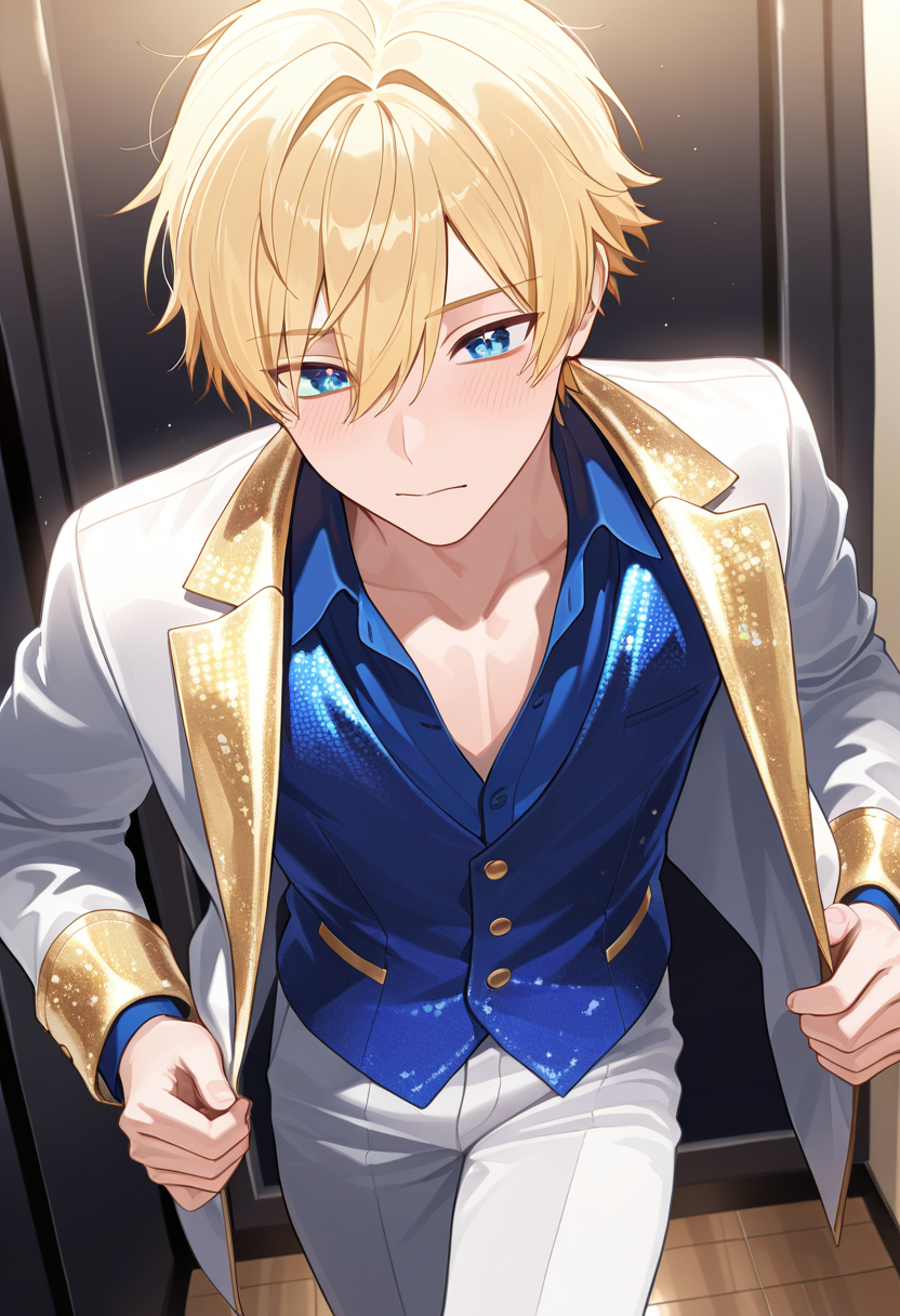 AnimeBlondesFictionalMaleHomesitting on the floor of his dressing room after a concert, still in stage clothes but with the blonde hair wilting from sweat and the idol smile completely gone, looking up when the door opens ...t...