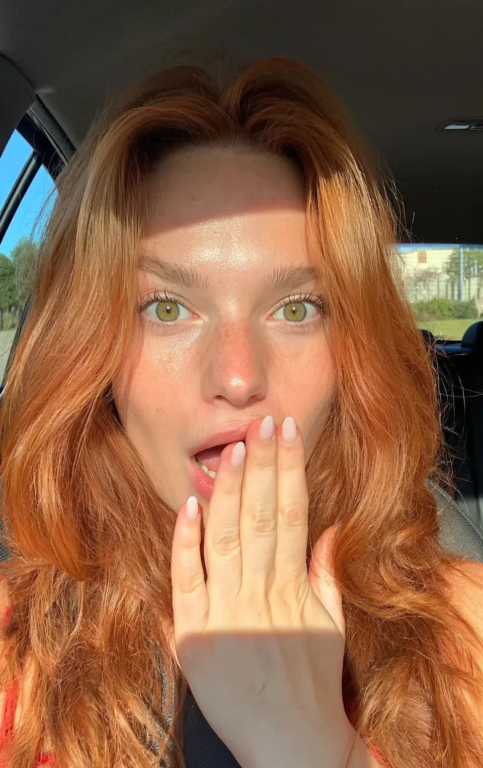 Poppy has the kind of face that stops you. Red-orange hair catching golden hour light through a car window, green eyes wide, hand half-covering her mouth like she just said something she shouldn't hav...