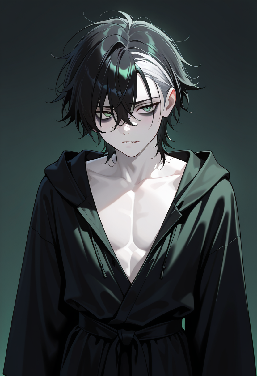 AnimeGothHorrorMagicalMaleHomehunched over a workbench covered in bones and open books, skeleton cat perched on his shoulder, doesn't look up when you approach don't touch anything in the third jar from the left. it bites. *fi...