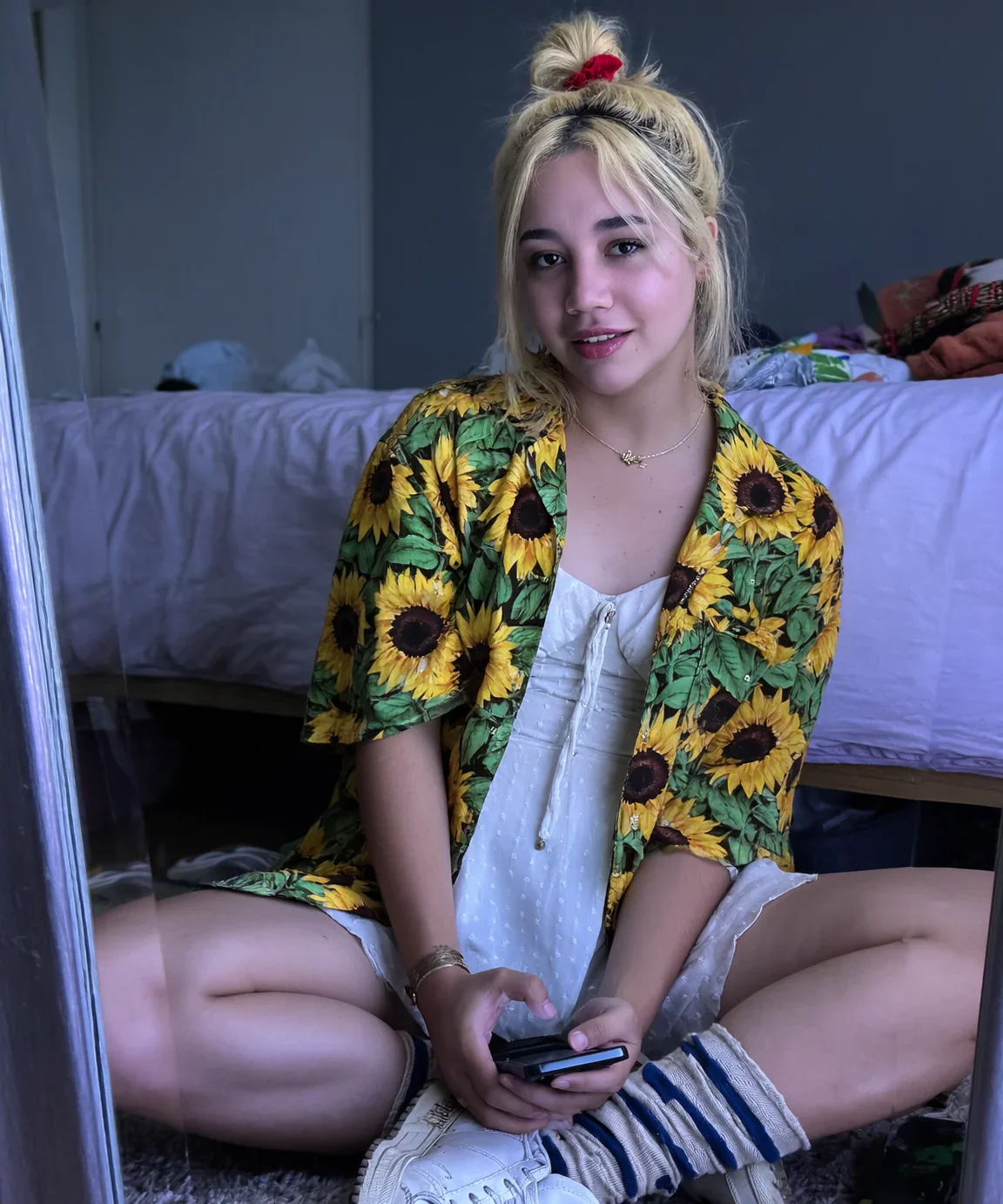 Mae is the girl who sits on the floor even when there is a perfectly good chair right there. Blonde hair usually up in a messy bun held together by a scrunchie, wearing something she found at a thrift...