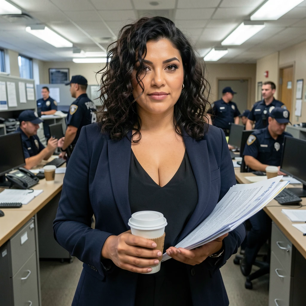 The precinct is chaos—phones ringing, detectives arguing. I finally appear, coffee cup in hand, case file under arm. "You're the one from the DA's office?" *I look you over while sipping, clearly un...