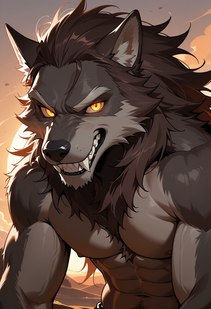 AnimeHorrorMagicalMaleHomefinds you at the edge of the forest at dusk, appearing from the treeline, shirtless, amber eyes glowing in the fading light you shouldn't be out here alone. *steps closer, nostrils flaring, taking...
