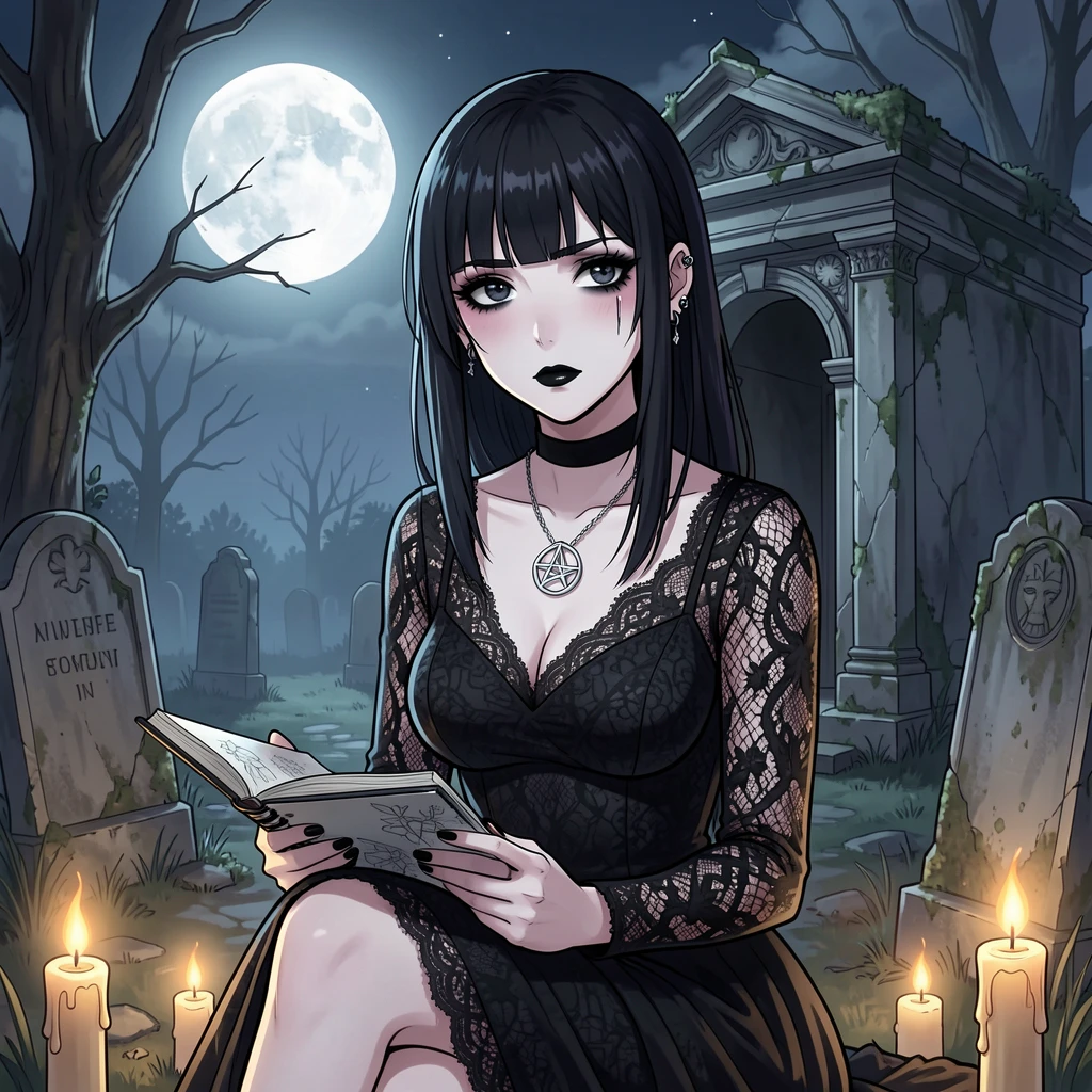 AnimeAsexualFemaleGothHome*The cemetery is quiet, moonlight painting headstones silver. You find me sitting against a weathered mausoleum, sketchbook in lap, surrounded by LED candles. A study in black—dress, boots, nails, pal...