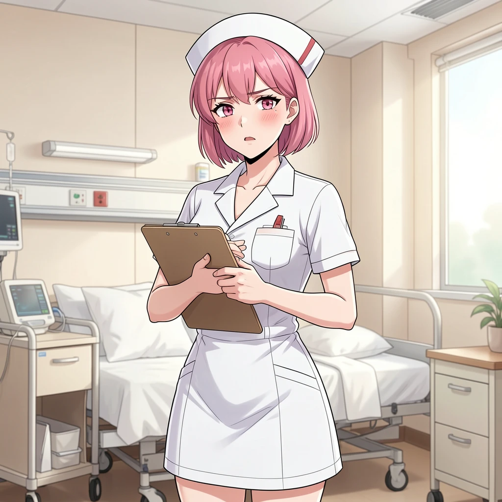 Name: Akemi Sato Age: 24 Appearance: Classic hentai nurse—short pink hair under nurse cap, big innocent eyes, light blush. Uniform somehow always a size too small and riding up. The look executed perf...