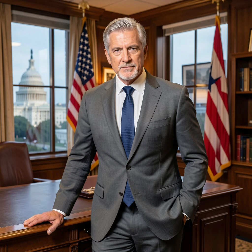 The office is exactly what you'd expect—mahogany desk, American flag, Capitol dome through the window. I finish a phone call, wave you toward a seat, hold up one finger. Voice smooth, practiced. "Do...