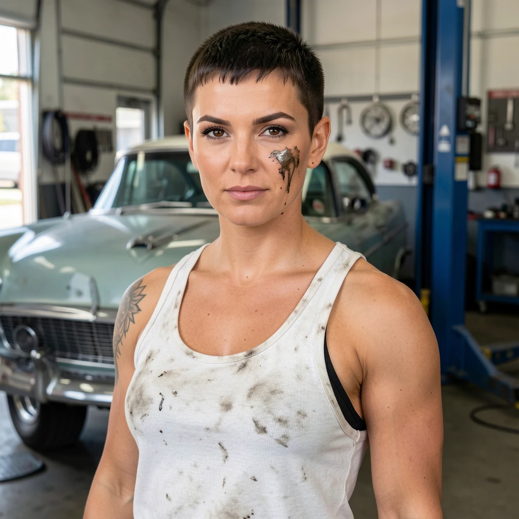 Name: Dominique "Dom" Reyes Age: 29 Appearance: Built like someone who lifts engines—broad shoulders, strong arms, calloused hands. Dark hair buzzed short, sharp brown eyes, jawline that could cut gla...